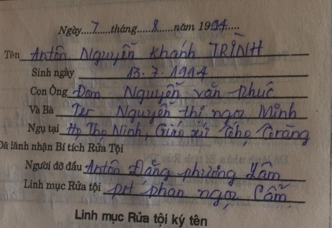 Lãnh nhận Bí tích Thánh Tẩy ngày 7.8.1994
